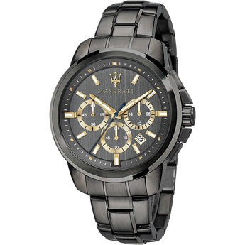 Orologio Maserati da uomo cronografo della linea Successo, referenza R8873621007, cassa e bracciale in acciaio con trattamento in PVD colore canna di fucile. La cassa ha un diametro di 44mm, il quadrante è di colore grigio con finiture colore oro. Il meccanismo è al quarzo con funzione di orario, datario e cronografo. La resistenza all'acqua è di 5atm.