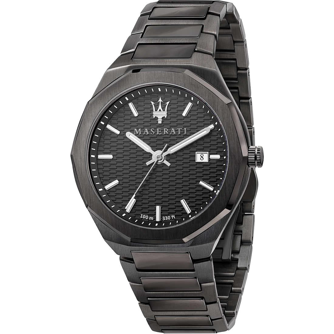 Orologio Maserati da uomo solo tempo della linea stile, referenza R8853142001, cassa e bracciale in acciaio con trattamento in PVD nero, il quadrante è di colore nero con indici e sfere chiari. Il meccanismo è al quarzo con funzione di solo tempo e datario. La cassa è di diametro 45mm. L'impermeabilità è di 10 atm.