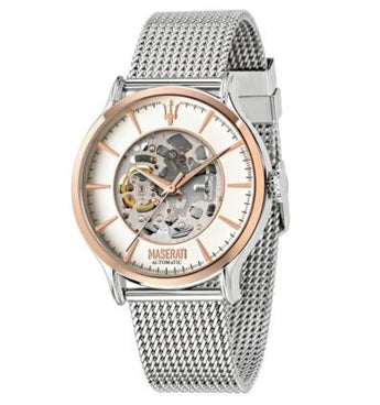 Orologio Maserati Epoca referenza R8823118004, Cinturino acciaio maglia mesch, cassa acciaio e trattamento PVD rosa, movimento automatico, quadrante bianco scheletrico.