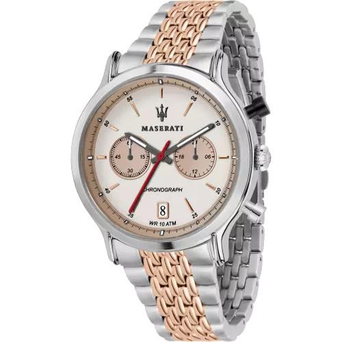 OROLOGIO MASERATI LEGEND - R8873638002 - Genere: Uomo, Materiale e finitura cassa: Acciaio, Misura cassa: 48,4x42mm, Spessore cassa: 9,7, Vetro: Vetro minerale, Materiale cinturino: Acciaio, Colore cinturino: Silver, Oro rosa, Chiusura: Box buckle with pushers, Water resistant: 10 atm, Garanzia: Ufficiale 2 anni Maserati, Confezione: Originale Maserati
