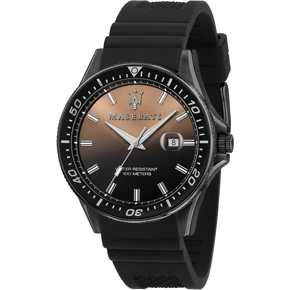 Orologio Maserati dellla linea Sfida, referenza R8851140001, cassa in acciaio con trattamento satinato e colore nero, cinturino in silicone con fibbia ad ardiglione, il meccanismo è al quarzo con funzione di tempo e datario, vetro minerale, impermeabilità di 10 atm.