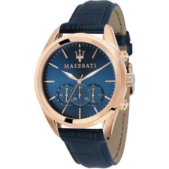 Orologio Maserati Traguardo referenza R8871612015, cassa acciaio con trattamento PVD rosa, quadrante blu, cinturino pelle blu, movimento al quarzo.
