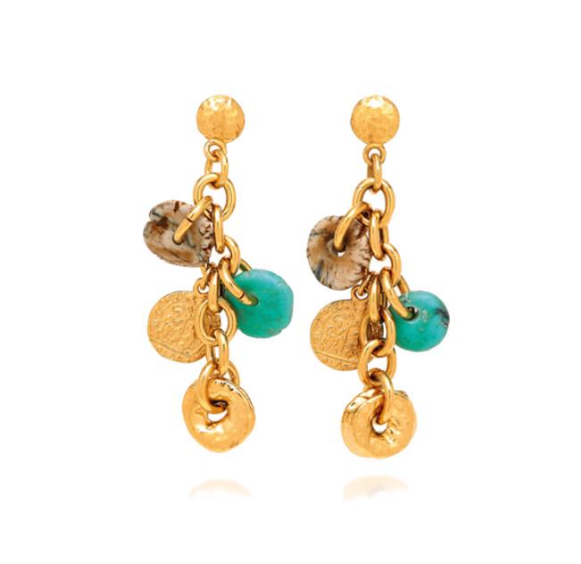 Orecchini Giovanni Raspini della collezione Bali, realizzati in argento 925 in bagno d'oro, turchese e diaspro color sabbia. Il peso della coppia di orecchini è di 24 gr. la lunghezza di 6,7 Cm. Chiusura con farfallina.