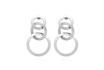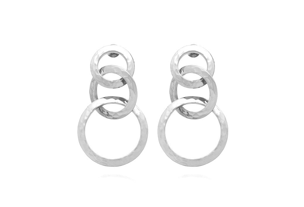 Un design scenografico e ricercato dà vita a questi splendidi orecchini a cascata firmati Giovanni Raspini. Composti da anelli in tre dimensioni, presentano una texture materica realizzata con lastra di argento 925 martellata a mano, capace di riflettere la luce in modo straordinario.