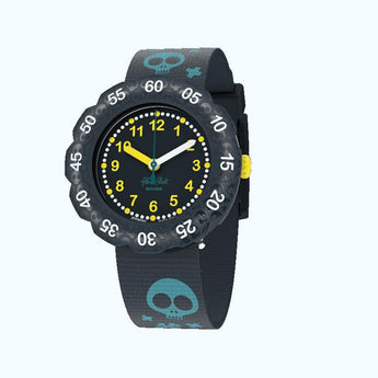 Orologio Flik Flak Flik Flak Magical Ocean Skeleticious, cassa in plastica, cinturino in tessuto, meccanismo al quarzo Swiss Made con funzione di solo tempo.