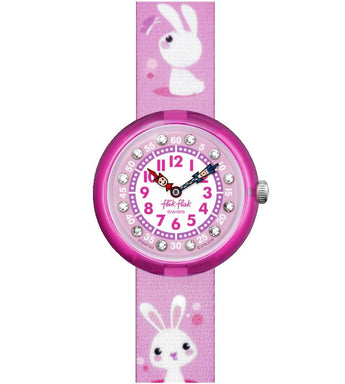 Orologio Flik Flak SO CUTE (FBNP143). Impara a leggere l’ora e scatena la magia con SO CUTE, l’orologio Swiss made rosa vivo con il cinturino in tessuto stampato costellato di coniglietti, la cassa in plastica trasparente rosa e un giro di splendenti gemme sul quadrante.