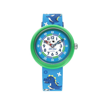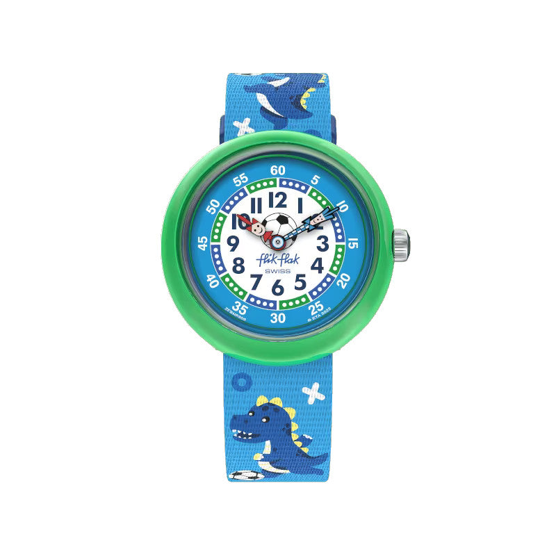 L'Orologio Flik Flak Soccerozaurus presenta un movimento al quarzo, è impermeabile a 3 Bar e ha un cinturino in PET riciclato, una fibbia e una cassa in plastica di origine biologica. È un articolo Blu della collezione FLIK FLAK SPORT LOVERS ed è presentato in una confezione speciale. Il quadrante e la cassa sono Blu e Verde. La forma della cassa è rotonda.