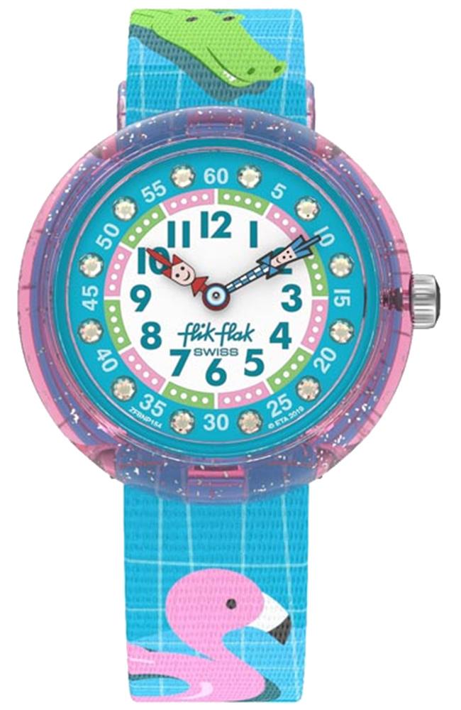 L'orologio Flik Flak Splashtastic Blue è alimentato al quarzo ed è dotato di un display analogico con solo la funzione del tempo. È resistente all'acqua fino a 3 ATM, con una cassa in plastica di colore rosa e un quadrante multicolore. Il cinturino è realizzato in tessuto multicolore con un diametro della cassa di 32 mm.