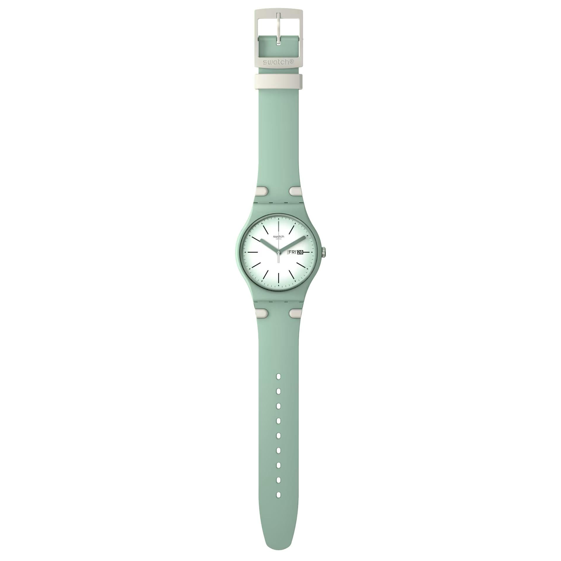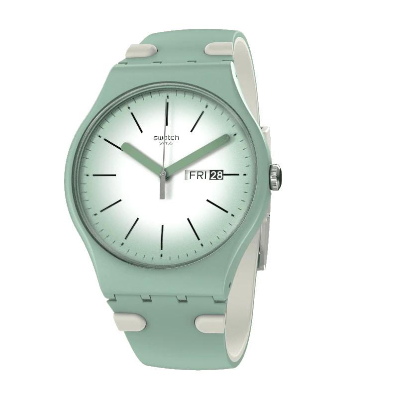 Orologio Swatch da donna con cassa in plastica di colore verde. Il quadrante è di colore chiaro. Il meccanismo è al quarzo Swiss Made con funzione di solo tempo. Il cinturino è in silicone di colore verde. La resistenza all'acqua è di 3 bar.