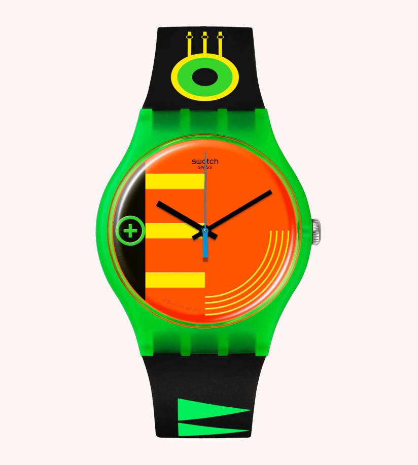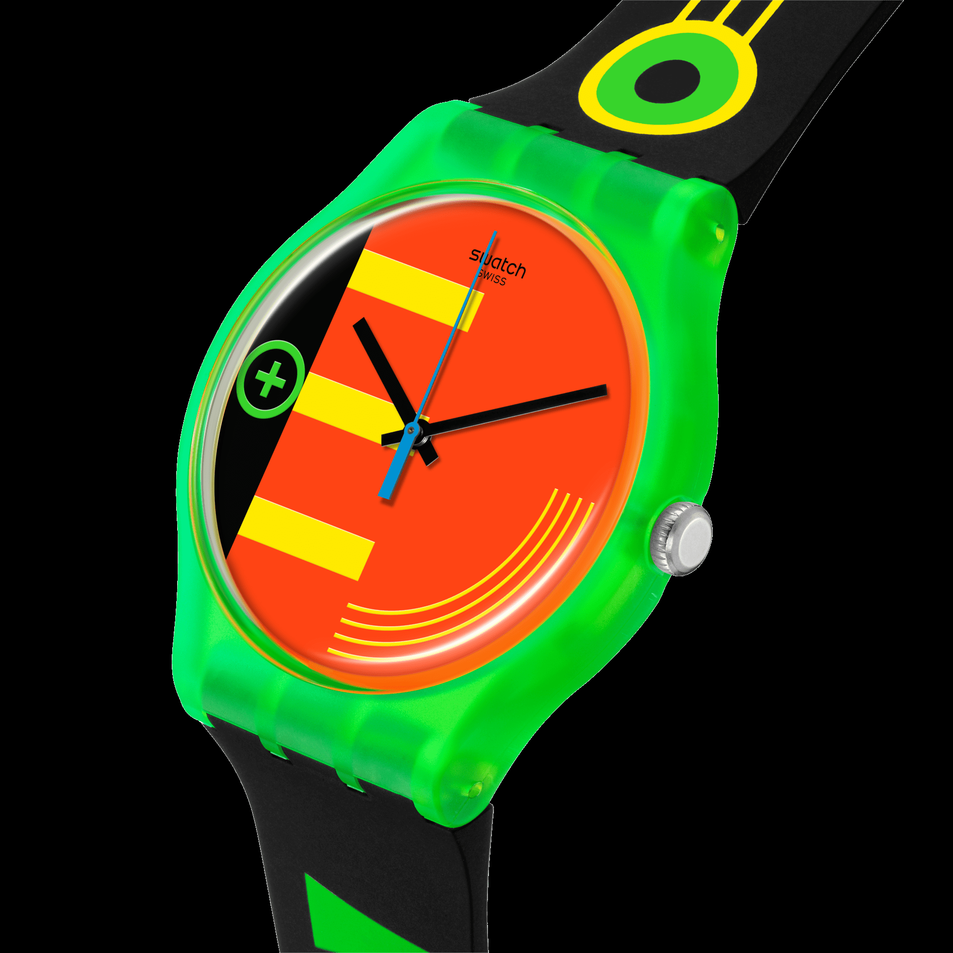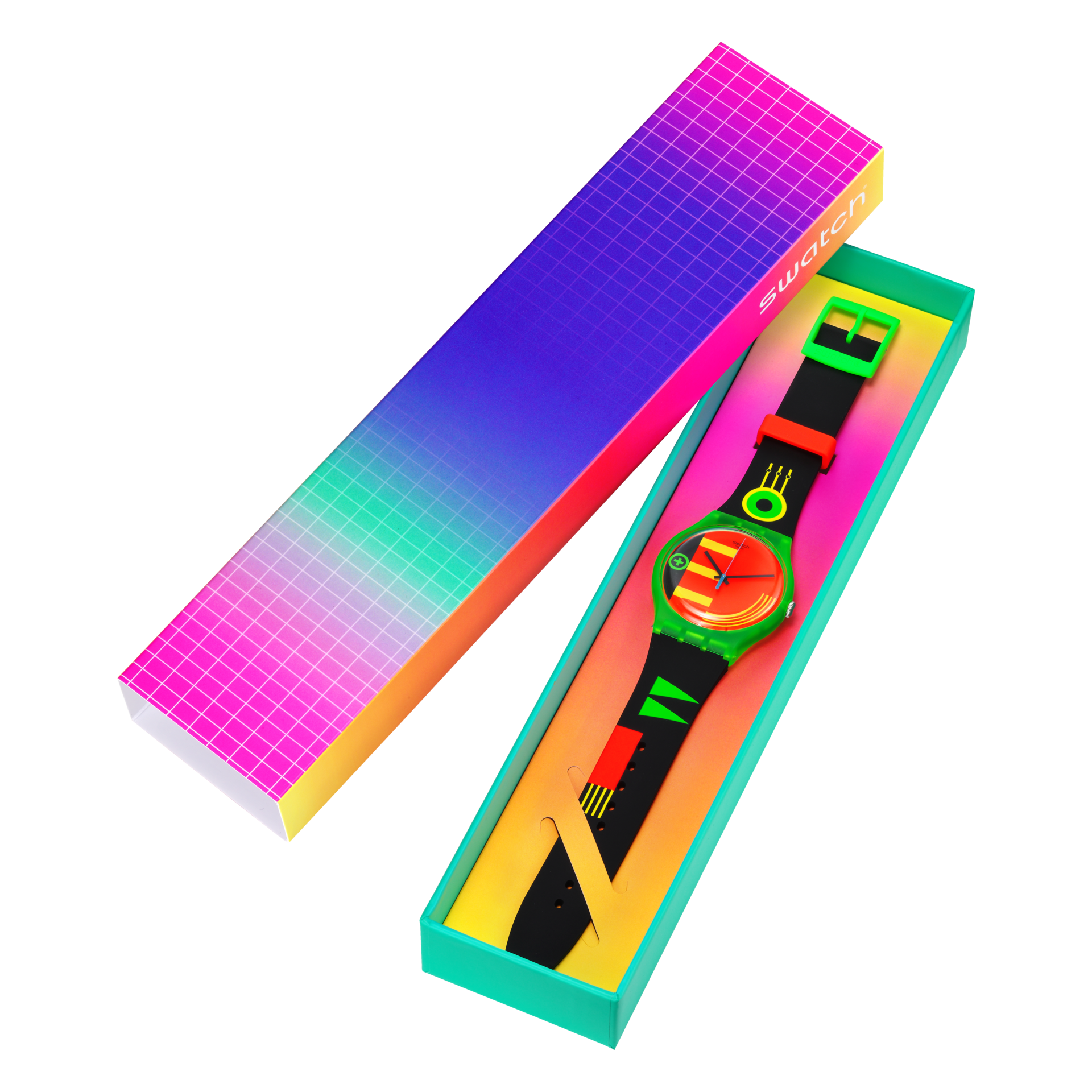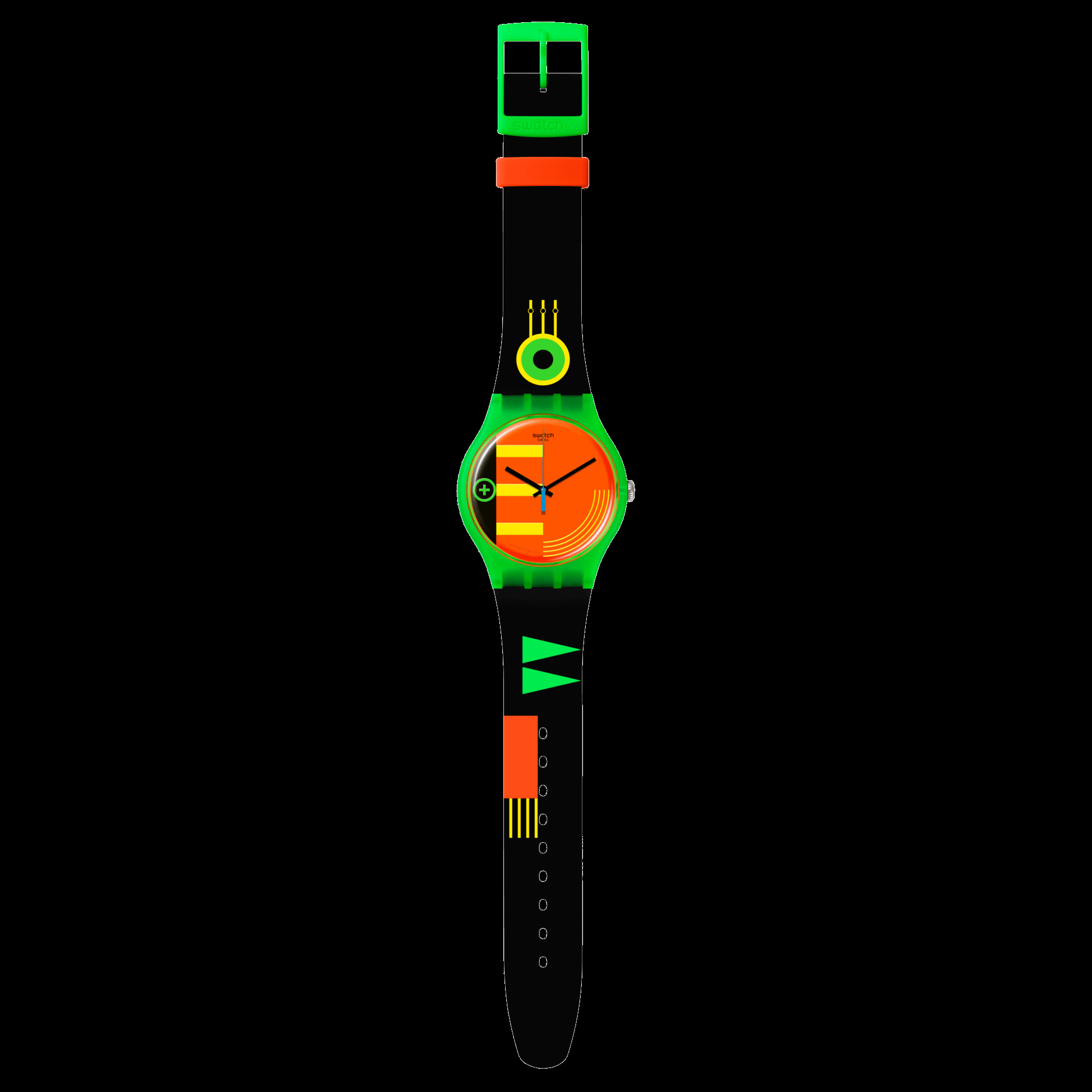 Ispirato all'iconica Swatch degli anni '80, il NEO RIDER (GG103), questo orologio retrò è un'esplosione di colori! Il quadrante multicolore presenta lancette nere e una cassa verde con vetro biosourced. Il cinturino nero con stampa neon e la fibbia verde completano il look unico di questo orologio.
