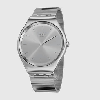 Orologio Swatch Skin Irony, referenza SYXS103GG, cassa in acciaio inossidabile di forma rotonda, meccanismo al quarzo Swiss Made. Bracciale in acciaio. Quadrante colore grigio. Resistenza all'acqua 3 bar.