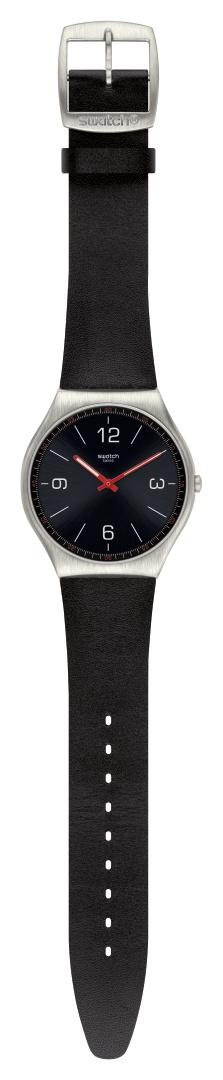 Super sottile e super elegante, SKINBLACK (SS07S100) ha il cinturino in pelle nera e il quadrante spazzolato con lancette e indici Swatch Glow.