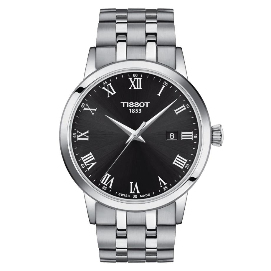 Orologio Tissot T1294101105300 TISSOT CLASSIC DREAM con cassa e bracciale in acciaio, Vetro zaffiro antigraffio, quadrante nero con numeri romani bianchi, indicazione di ora e data. Resistente all'acqua fino alla pressione di 5 Atm.