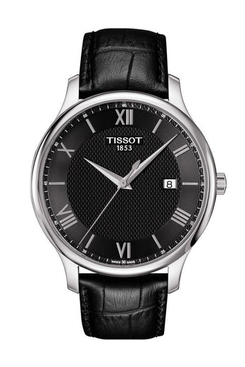 Orologio Tissot della Linea Tradition, Cassa in acciaio con Cinturino in Pelle Nera, Quadrante Nero Con Indici Romani, Datario e Vetro Zaffiro antigraffio.