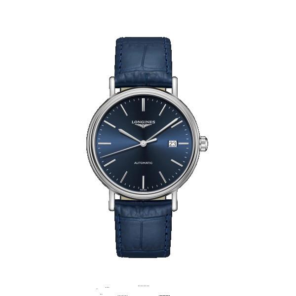Orologio Longines Présence, referenza L49224922, cassa di forma rotonda, in acciaio inossidabile con un diametro di 40mm e uno spessore di 8,90mm. Il vetro è in zaffiro antigraffio. Il fondello è trasparente con vetro in zaffiro antigraffio. La resistenza all'acqua è di 3 bar. Il quadrante è di colore blu con lavorazione a raggi di sole, indici applicati e lancette argentate lucide. Il movimento è automatico Swiss Made calibro L888 con frequenza di 25'200 alternanze orarie e riserva di carica di circa 72 ore. La funzione è di solo tempo e data.