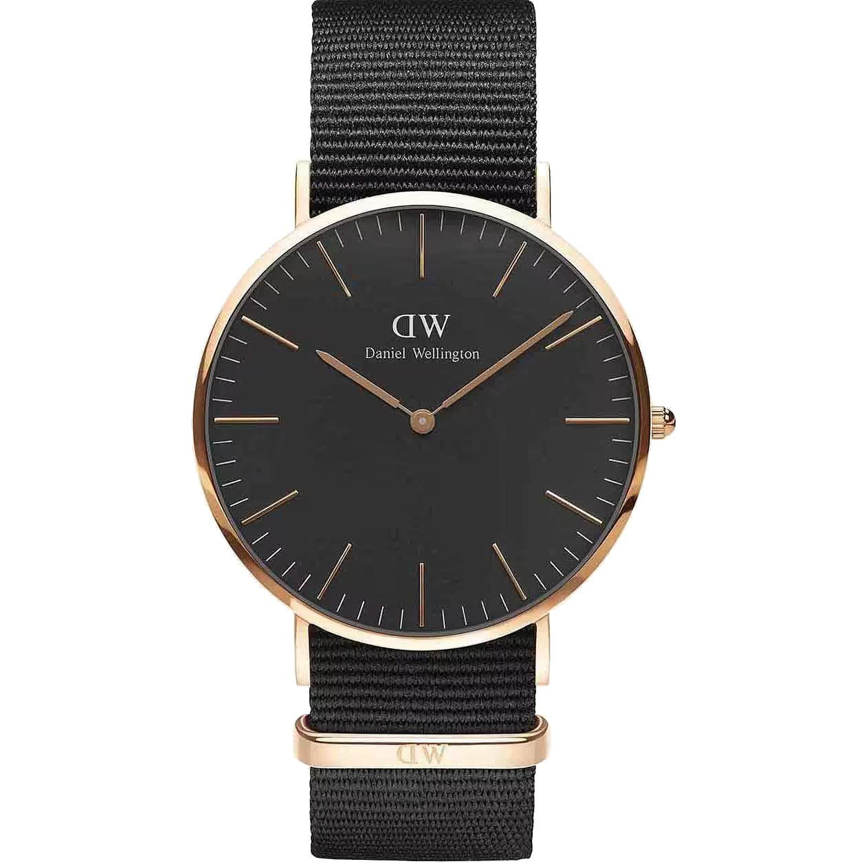 Orologio Daniel Wellington da uomo, cassa in acciaio inossidabile con placcatura oro rosa, diametro della cassa 40 mm, quadrante di colore nero. Meccanismo al quarzo con funzione di solo tempo. Cinturino in tessuto.