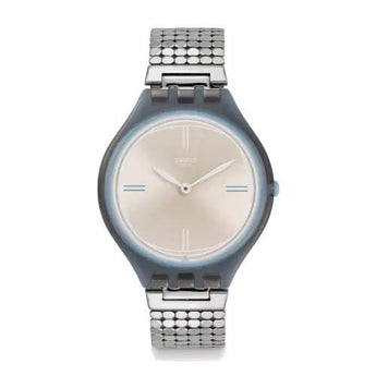 Orologio Swatch Skin, referenza SVOM101GB, cassa in plastica di forma rotonda, meccanismo al quarzo Swiss Made, bracciale in acciaio inossidabile. La resistenza all'acqua è di 3 bar.