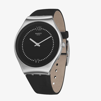 Orologio Swatch Skin Irony, referenza SYXS109, cassa in acciaio inossidabile di forma rotonda, il quadrante è di colore nero con rifiniture colore acciaio. La resistenza all'acqua è di 3 bar. Movimento al quarzo Swiss Made.