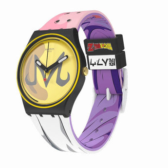 Orologio Swatch X Dragonball Z, dedicato a Majin Buu, cassa di colore nero e quadrante giallo. Cinturino in silicone rosa. Meccanismo al quarzo Swiss Made con funzione di solo tempo. Resistenza all'acqua 3 bar.