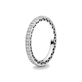 Anello in Argento Sterling 925 e Cubic Zirconia. Anello dal design semplice e raffinato con cubic zirconia incastonate lungo tutta la circonferenza dell'Anello, e rifinitura laterale con motivo a cuori traforati. Indossalo da solo o abbinato ad altri anelli per un look ogni giorno diverso.