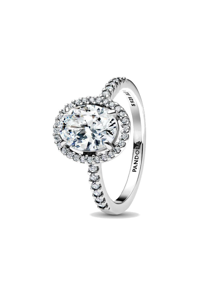 Anello Punto Luce Ovale in Argento Sterling 925. Con una pietra ovale rialzata circondata da pavé di zirconia cubica.