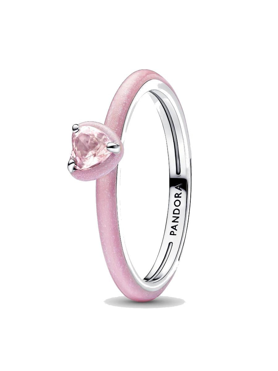 Anello in Argento Sterling 925. La fascia è ricoperta per tre quarti da smalto rosa e impreziosita al centro da un cristallo rosa creato dall'uomo a forma di cuore.