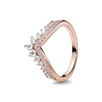 Anello in esclusiva lega metallica ricoperta in oro 14Kt. e Cubic Zirconia. Anello dal classico design Chevron della linea Wish Pandora, in questa versione diventa un anello veramente principesco come il suo nome: decorato con una doppia fila di luminosissimi Cubic Zirconia bianchi. Una fila di pietre più piccole accompagnano un'altra fila di pietre più grandi che rendono l'anello adatto ad essere indossato anche in occasioni più eleganti e formali.
