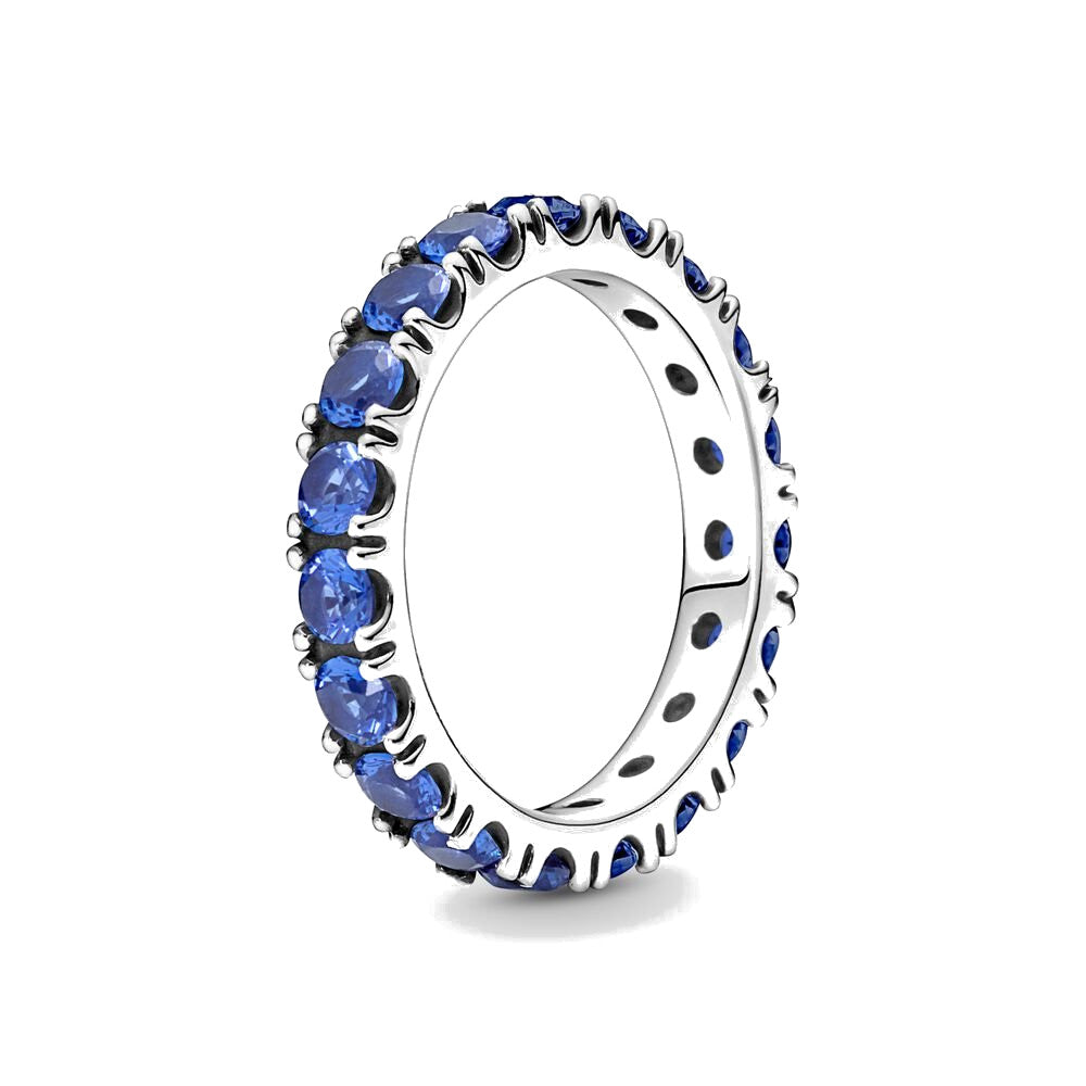 Anello Eternità scintillante. Rifinito a mano e realizzato in argento sterling 925, l’anello presenta una fascia interna decorata da cristalli blu sfavillanti creati dall’uomo.