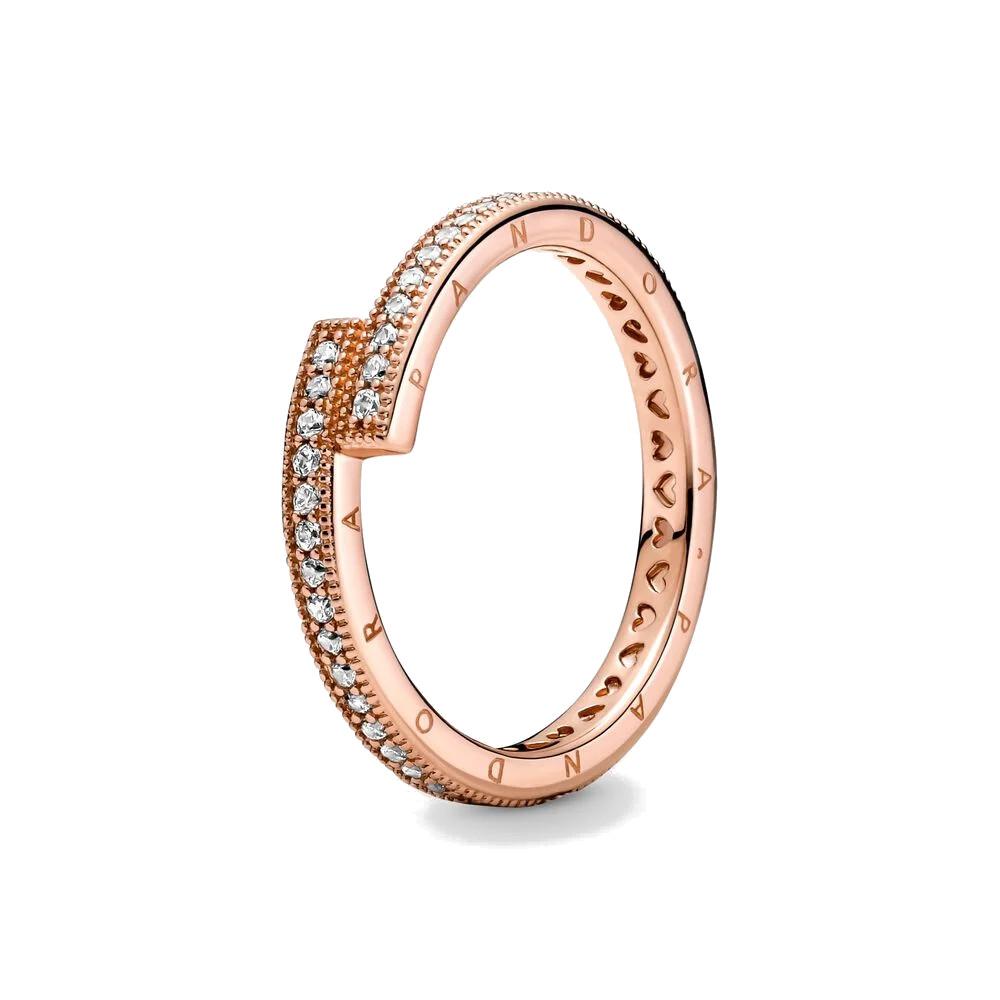 Anello rifinito a mano e con placcatura in oro rosa 14k presenta un disegno asimmetrico in cui le estremità squadrate della fascia si sovrappongono parzialmente, creando angoli a 90 gradi. La fascia esterna è decorata da un pavé di pietre di zirconia cubica incolori circondato da micro-sfere, i lati mostrano il logo Pandora e la fascia interna è ornata da cuori intagliati.