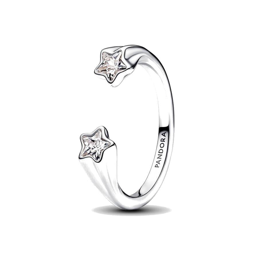 Risplendi con l'Anello Stelle Cadenti in Argento Sterling 925. Due pietre di zirconia cubica adorne una fascia aperta con decoro a stella cadente. Rappresenta l'idea che il mondo è più luminoso con chi ci sta accanto. Perfetto da solo o combinato con altri anelli celesti.