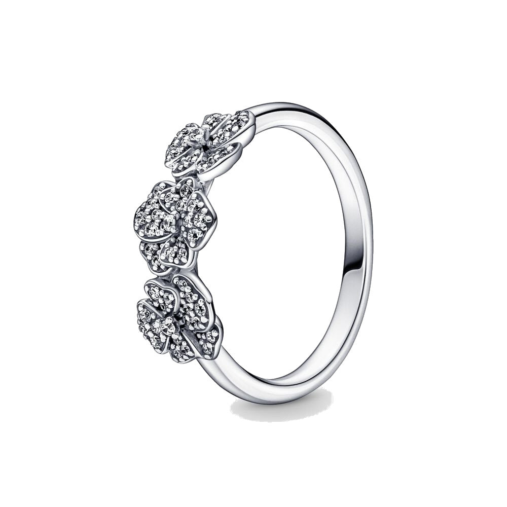 Anello Pandora con tripla viola del pensiero. Tre viole del pensiero sbocciano lungo la fascia in argento sterling 925 lucido. Ogni fiore presenta sfavillanti pietre di zirconia cubica con taglio brillante.