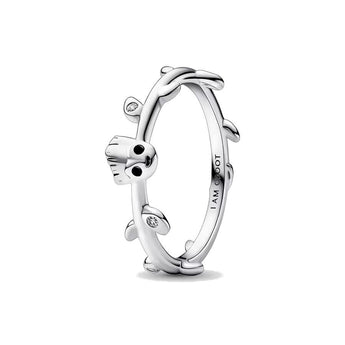 Anello con Foglie Groot della serie Guardiani della Galassia Marvel. Rifinito a mano e realizzato in argento sterling 925, il gioiello presenta il volto sorridente di Groot al centro e foglie lungo la fascia. Gli occhi di Groot sono dipinti da smalto nero applicato a mano che aggiunge profondità e brillantezza, mentre quattro foglie sono incastonate a filo con pietre di zirconia cubica incolori. L'unica frase che pronuncia sempre, "I AM GROOT", è incisa all'interno della fascia.