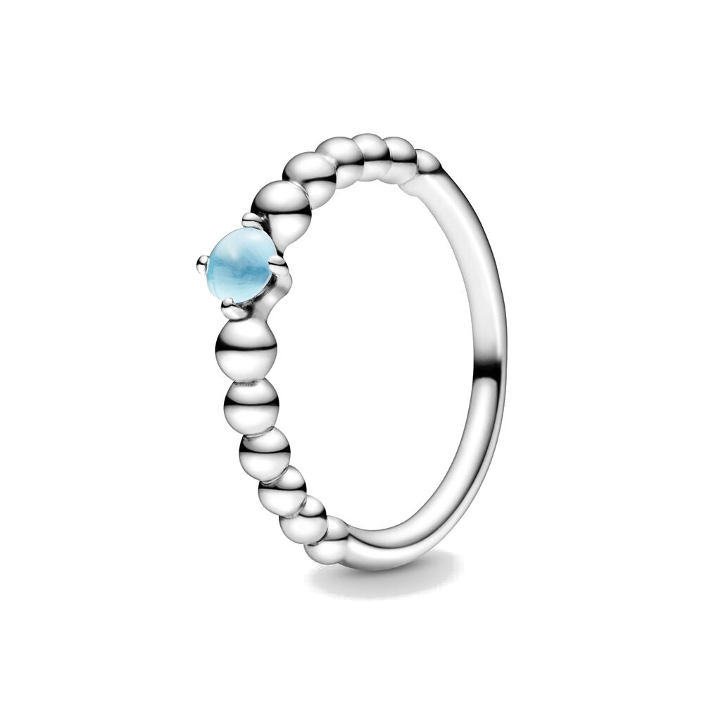 Anello rifinito a mano e realizzato in Argento Sterling 925 presenta un cristallo artificiale azzurro cielo con taglio buff top incastonato a griffe.