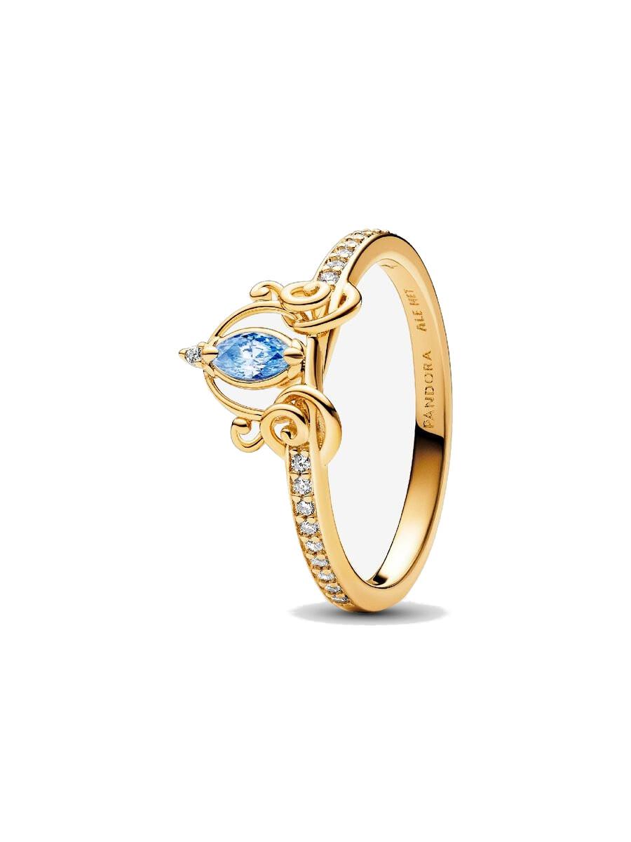 Anello Disney, Anello Carrozza di Cenerentola. Realizzato nell'esclusiva lega metallica placcata oro 14k, l'anello presenta una lavorazione openwork che crea la forma di una carrozza dettagliata, con trafori e linee stratificate, impreziosita al centro da una pietra di zirconia cubica azzurra con taglio marquise. Le linee delle ruote collegano la carrozza alla fascia dell'anello, metà della quale è decorata da luminose pietre di zirconia cubica incolore.