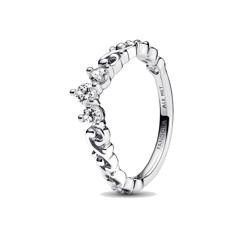 Anello regale Tiara e spirali. Realizzato in argento sterling 925, questo gioiello presenta una tiara decorata da tre pietre sfavillanti e dettagli filigranati che creano linee a spirale.