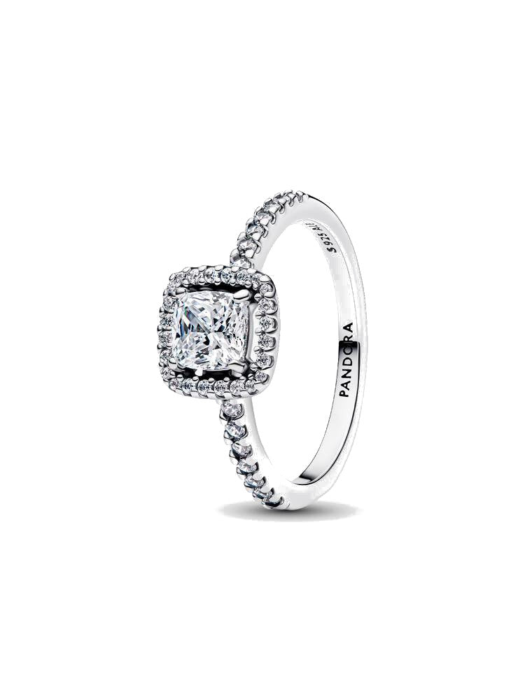 Al centro spicca una zirconia cubica quadrata con taglio cuscino, circondata da una corona di pavé scintillante che cattura ogni raggio di luce, esaltando la tua luminosità naturale e la tua femminilità.