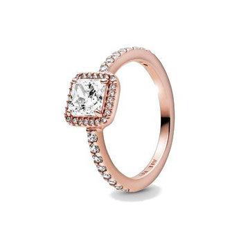 Anello in esclusiva lega metallica ricoperta in oro 14Kt. e Cubic Zirconia. Anello dal disegno classico e intramontabile, è decorato con una grande luminosissima pietra centrale di taglio quadrato contornata di altre Cubic Zirconia che vanno ad incorniciare oltre che il contorno della pietra principale, anche tutta la circonferenza del gambo dell'anello.
