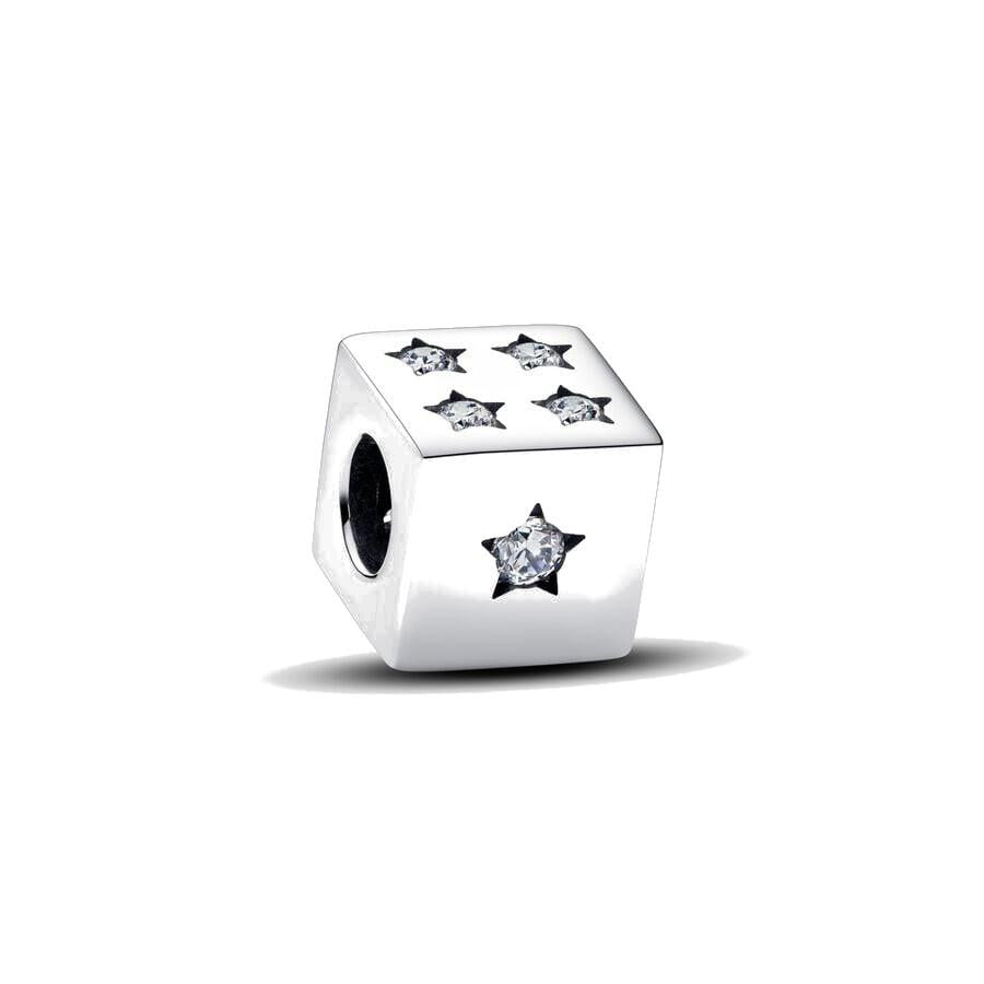 Lancia il Charm Dado Fortunato in Argento Sterling 925 nella tua collezione. Le incisioni a forma di stella su ogni faccia rappresentano i numeri fortunati, incastonati con pietre rotonde. Porta fortuna ovunque tu vada o regalalo per augurare buona fortuna.