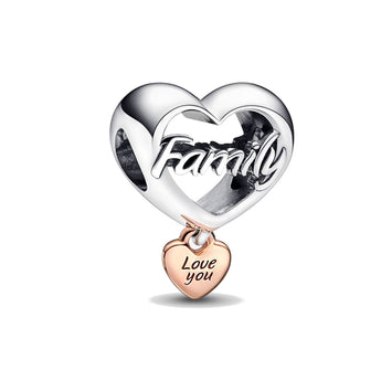 Charm Openwork Family. Realizzato in Argento Sterling 925, questo gioiello a forma di cuore presenta la scritta "Family" con lavorazione openwork su entrambi i lati. Un piccolo pendente a forma di cuore nell'esclusiva lega metallica placcata oro rosa 14k aggiunge un tocco di sentimento, con le parole "Love you" incise su entrambi i lati.