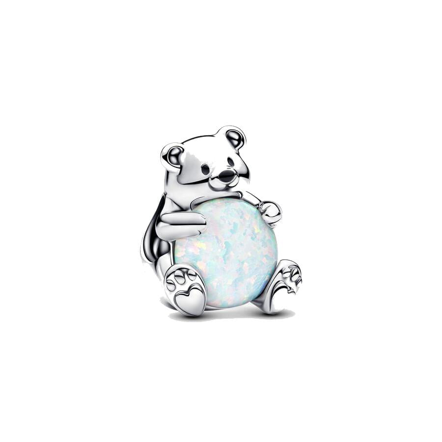 Charm Orso Polare "Warm Hugs". Un orso polare in Argento Sterling 925, rifinito con dettagli del muso in smalto nero, abbraccia un opale iridescente creato in laboratorio che ricorda una palla di neve. Il retro dell'orso reca l'incisione "Warm Hugs" (Caldi abbracci).