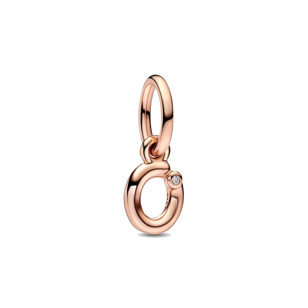 Charm pendente Alfabeto con lettera o. Ispirato a un filo piegato e al movimento di una penna sulla carta, il charm con placcatura in oro rosa 14k presenta una lettera tridimensionale k che sembra scritta a mano. L'estremità della lettera minuscola è giocosamente punteggiata da una pietra di zirconia cubica incolore con taglio brillante rotondo.