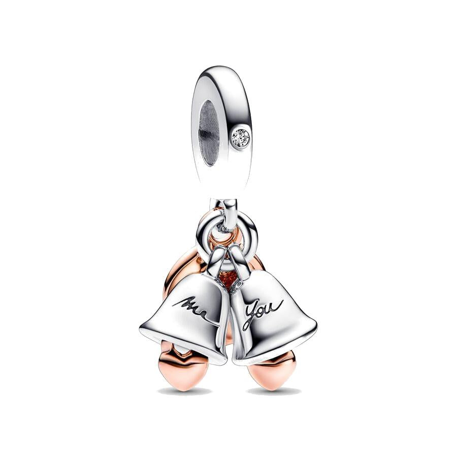 Charm Pendente Campane Nuziali "Just Married" è una celebrazione del traguardo più importante di ogni storia d'amore. Il gioiello presenta due campane nuziali pendenti in Argento Sterling 925, ognuna con all'interno un piccolo pendente a forma di cuore nell'esclusiva lega metallica placcata oro rosa 14k. Una campana reca l'incisione "You" e l'altra "Me". Un disco nell'esclusiva lega metallica placcata oro rosa 14k con il messaggio "Just married" (Appena sposati) completa il charm.