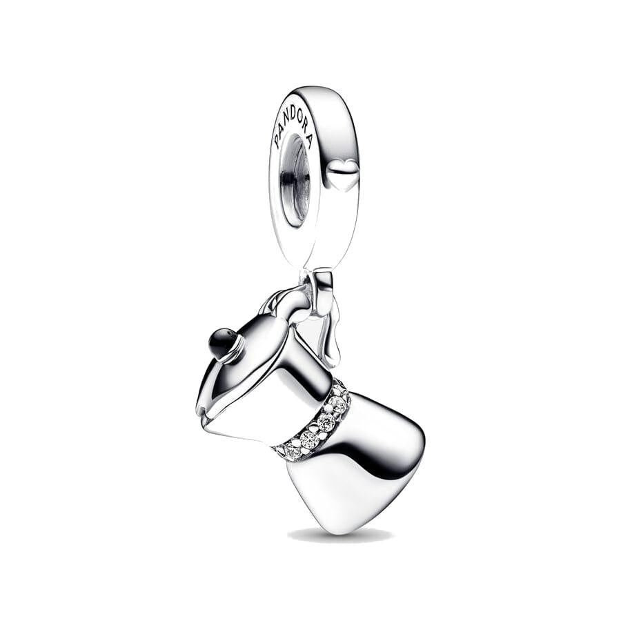 Charm Pendente Moka. Questa caffettiera inconfondibile è diventata un'icona della cultura italiana del caffè. Il charm a forma di moka è realizzato in Argento Sterling 925 e presenta un coperchio apribile con il pomello decorato da smalto nero, una fascia di pavé intorno al centro e un cuore intagliato sul fondo.
