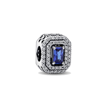 Charm Pavè e Pietra Blu in Argento Sterling 925. Ogni lato del charm presenta un cristallo creato dall'uomo blu rettangolare con taglio radiante al centro, circondato da due file di pietre di zirconia cubica incolori incastonate a granette. Infine, un motivo con cuori intagliati decora i lati.