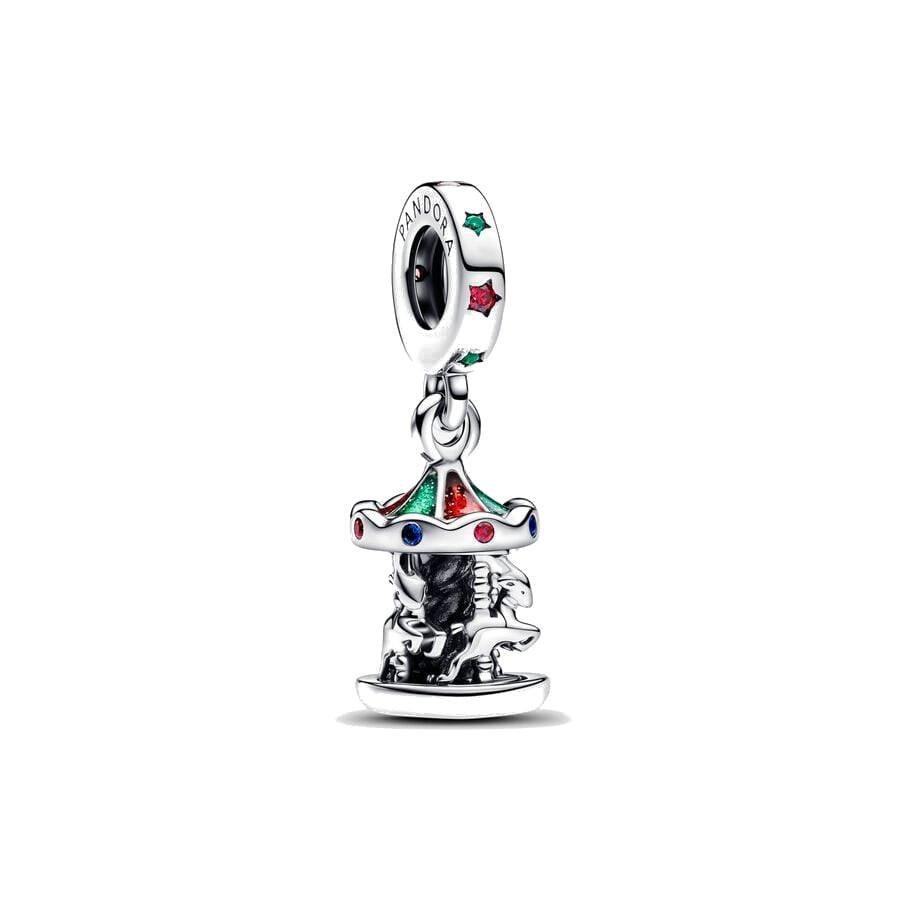 Charm Pendente Giostra di Natale. Realizzata in Argento Sterling 925 e decorata da smalto colorato e pietre luminose, questa giostra raffigura Babbo Natale e due renne che girano intorno. La parte inferiore del charm reca l'incisione "HAPPINESS, JOY, PEACE, HOPE, LOVE" (Felicità, Gioie, Pace, Speranza, Amore).