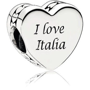 Charm Pandora in argento 925, nella parte anteriore c'è la scritta I LOVE ITALIA mentre nel contorno c'è la lavorazione a cuore.