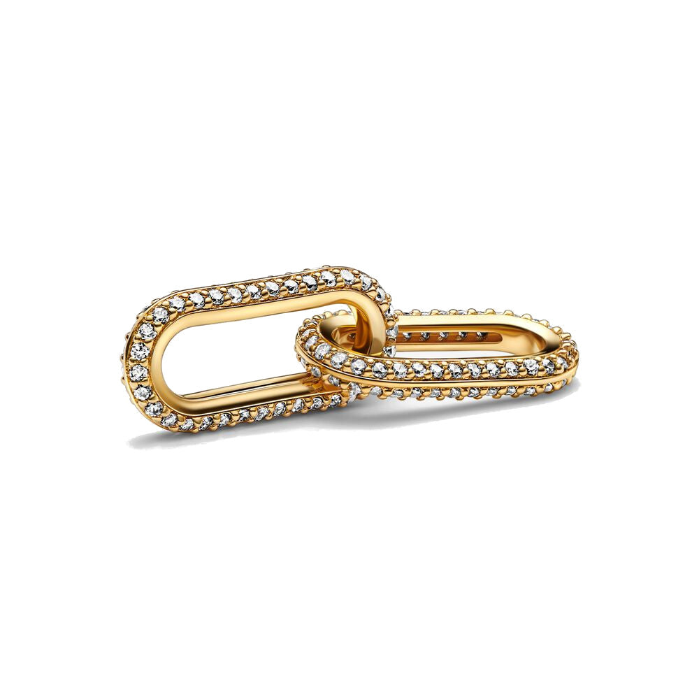 Costituito da due link intrecciati, decorati da due file di pietre di zirconia cubica incolore taglio brillante, ciascun link è rifinito a mano e realizzato nell'esclusiva lega metallica placcata oro 14K. Inseriscilo tra i link apribili su una collana o un bracciale a maglia link Pandora ME oppure aggiungilo a un paio di orecchini a cerchio per un look unico che attirerà ogni sguardo.
