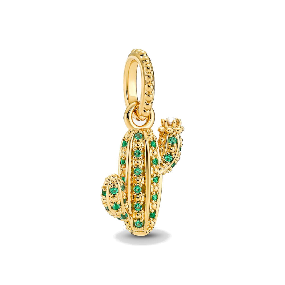Il pendente con placcatura in oro 14k presenta file di cristalli creati dall'uomo verdi e una perla artificiale laccata che raffigura il fiore sbocciato su un ramo del cactus.