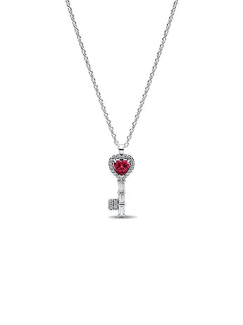 Scopri il potere dell'amore con questo pendente a forma di chiave e cuore, un gioiello che unisce eleganza e simbolismo. Realizzato in Argento Sterling 925, il pendente è impreziosito da un cristallo rosso creato dall'uomo al centro, circondato da pietre di zirconia cubica incolore, che catturano la luce con brillantezza e rendono il design raffinato e luminoso.