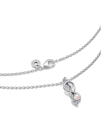 Collana in Argento Sterling 925. Una perla rosa artificiale si inserisce all'interno di un nodo dell'infinito, decorato da pietre luminose. Regolabile per una vestibilità perfetta, simboleggia l'amore eterno.